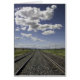 Ein Eisenbahnbett mit zwei Gleisen verblasst in die Ferne unter einem großen Montana-Himmel.