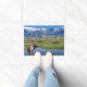 Diese Freienthemafußmatte kennzeichnet eine atemberaubende Naturszene mit Bergen, einem Strom des kalten Wassers und einem Stierelch. Der Elch oder der Wapiti ist ein ikonenhafter Bewohner von Nordamerikas Rocky Mountains-Region.