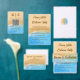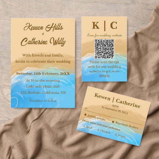 Modern coastal wedding invitation featuring soft blue ocean waves and sandy beige watercolor textures. Perfect for beach weddings, seaside ceremonies, summer weddings, and destination celebrations. Elegant script typography with a romantic aesthetic. This rsvp card is customizable with your wedding details like name, menu.