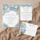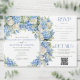 Elegantes blumengeschmücktes Hochzeitsdesign mit Aquarellmalerei und Blumenarrangements aus blauen Hydrangea-Blume, Grünpflanzen und weißen Rosen.