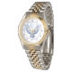 This unique and mystical watch features a blue owl with outstretched, pattern image wings. His penetrating eyes look straight ahead and claws are outstretched. In the distance, behind and above him, is a crescent mood and silvery blue stars. Dark blue numbers make the watch easy to read, and a thin matching blue circle frame separates the inside bird and moon images from the numbers on the circular border. Everything stands out on a crisp white background.