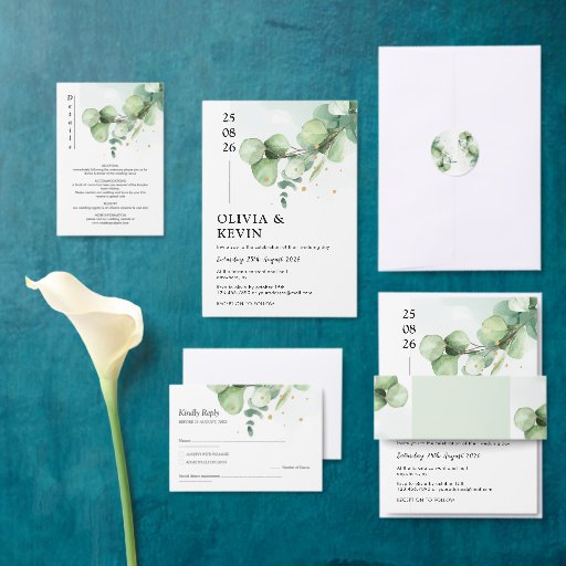 Eine elegante RSVP-Karte mit Aquarell-Eukalyptusgrün und edlen Goldakzenten. Eine elegante Ergänzung zu Ihrer Hochzeitsgeschenksuite, die sich perfekt für rustikale, boho oder moderne Feiern eignet. Passen Sie diese Antwortkarte an Ihren eleganten Hochzeitsstil an und sammeln Sie bequem die Antworten der Gäste.