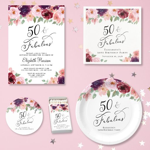 Elegante und schicke 50. Geburtstagsfeier mit "50 & Fabulous" in stilvollen Drehbüchern und Aquarellbouquets aus bordeauxrot, rot-weiß-pink und pflaumenfarbenen lila Blumen mit leichter Salbeigrün. Personalisieren Sie einfach ihren Namen und die Party-Details.