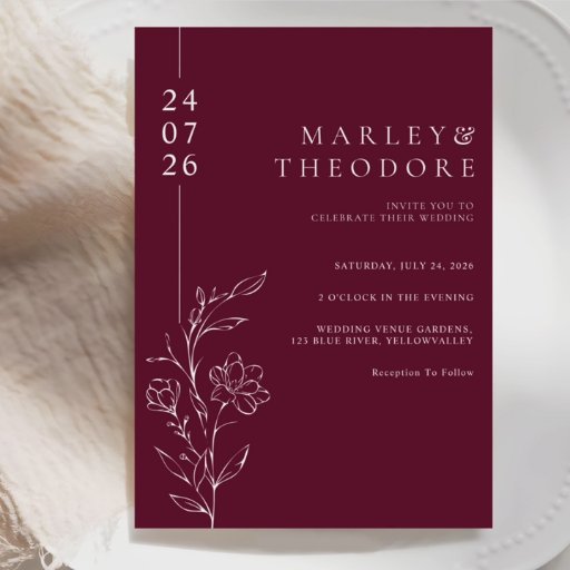 This elegant thank you card features chic sketched floral line art on a deep burgundy background. The simple typography adds a modern and polished look. The simple layout keeps the focus on your names, date and message while maintaining a refined style. This design is ideal for couples who want a modern yet artistic finish that matches a burgundy wedding theme. It pairs well with formal, romantic, fall, and winter weddings.