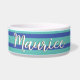 Eine stilvolle Futter- oder Wasserschale für Ihren Haustierhund, mit einem attraktiven Design von frisch blauen und aqua Streifen. Personalisieren Sie mit dem Namen Ihres Haustieres in der Schriftzeichen-Typografie, für eine elegante individuelle Touch.