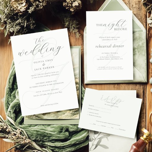 Elegant Sage Green Calligraphy Wedding All In One Einladung