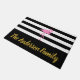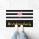 Lass deinen Besuchern, dass sie die richtige Zuhause erreicht haben. Sie können Ihren Familiennamen in Imitate Gold Skript auf dem breiten schwarzen Streifen unten hinzufügen. Der Hintergrund ist schwarz-weiße Streifen. Ein rosa Flamingo liegt über dem Text.