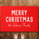 Eine klassische Weihnachtsmatte mit einer lebhaften roten Farbe. Mit fett gedrucktem, modernem Weißtext, der neben einem personalisierten handgeschriebenen Namen oder Nachnamen des Empfängers "Frohe Weihnachten" lautet, ist es eine durchdachte und einzigartige Touch für das Feiertagsgeschenken.