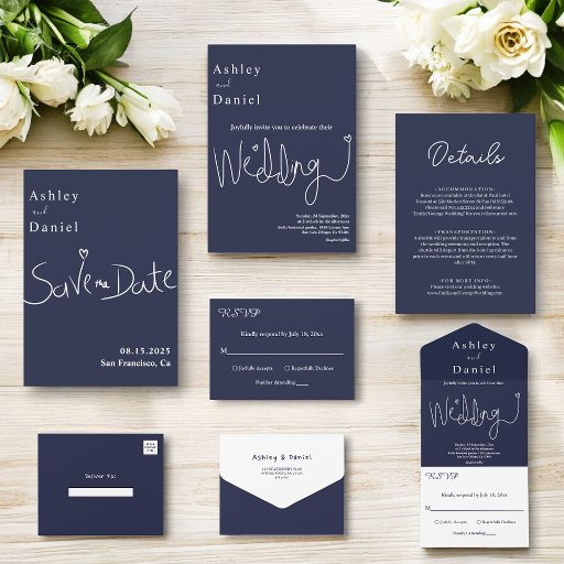 hochzeitelegantmoderneinfachmarineblauformellschickminimalzierlichkalligraphie