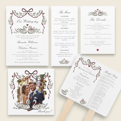Add a touch of vintage charm to your wedding reception with these exquisite swan couple wedding place cards. The design showcases a pair of swans gracefully intertwined, symbolizing eternal love and commitment. The handwritten-style font for names, paired with the delicate botanical elements and a sweet red bow, creates a unique and romantic atmosphere. These place cards are a beautiful way to direct your guests and leave a lasting impression of your wedding's elegant theme. They are ideal for a classic or rustic wedding celebration.