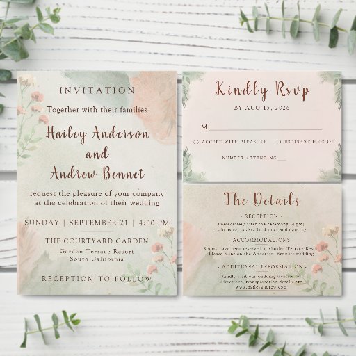 Check our Soft Peach & Green Watercolor Wedding Collection for matching suite.