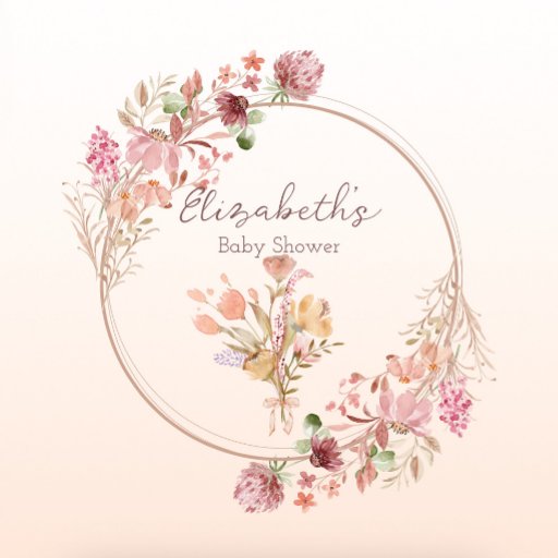 This graceful floral baby shower invitation features a gorgeous watercolor wildflower wreath with gradient peach colored background perfect for spring, summer, or fall baby girl showers. Find matching items for a themed baby shower in the Elegant Wildflower Wreath Collection.