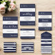 Diese elegante marineblaue und weiße Hochzeitsfeier eignet sich ideal für eine moderne Hochzeit. Das schlichte Design zeichnet sich durch eine elegante blau-weiße Kalligraphie auf dem Hintergrund der blau-weißen Streifen aus.