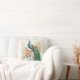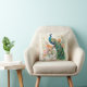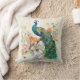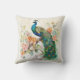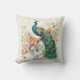 Der Dekorator trägt das Kissen mit einem Gemälde eines eleganten blauen und grünen Pfaues in den Zweigen eines Baumes voller rosa und pfirsichfarbener Blume.