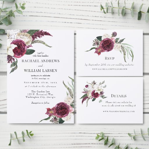Eine elegante Hochzeitsinie im skurrilen Stil mit einem wunderschönen Blumendesign in Bordeaux, Weiß und Salbei mit einem schönen und stilvollen Typografie-Schriftart. Es kann leicht personalisiert sein, Ihre Hochzeitsdetails einzufügen, um eine einzigartige und besondere Touch für Ihren großen Tag zu schaffen. Ideal für eine Herbsthochzeit im Herbst oder zu jeder Jahreszeit. Weitere passende Produkte finden Sie in der folgenden Kollektion.