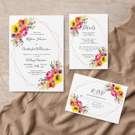 Dieses hübsche, elegante Design besticht durch helle Blumenbouquets mit Blume in Korallen-, Orange-, Rosa-, Rot-, Gelb- und lila-Tönen sowie durch einen trendigen geometrischen Rahmen aus Kupfer. Im Rahmen befindet sich der individuell anpassbare Text für Ihre besondere Veranstaltung in beliebter Typografie. Auf der Rückseite der Karte befindet sich ein Korallenhintergrund. Sie können dieses Element personalisieren, indem Sie den Text in der Vorlage ändern.
