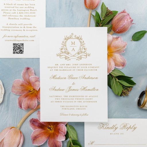 Elegant Gold Floral Crest Monogram WeddingDesignt von Jessica Letterman