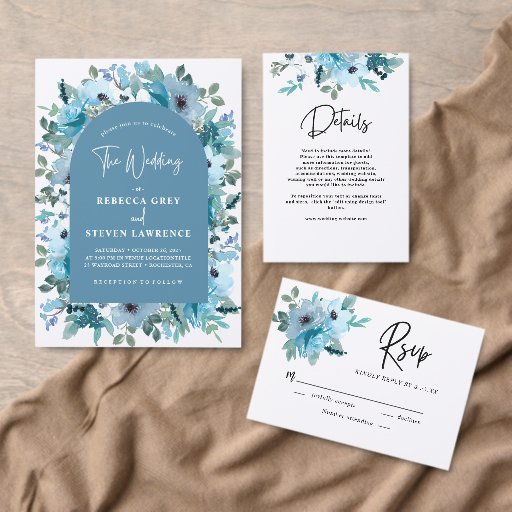 Elegante Frühlingsweiße staubblaue Blumen Hochzeit Einladung. Feiern Sie Ihre Liebe mit dieser individuell gestaltbaren Frühjahrsheirat-Einladung mit einem zeitlosen, staubblauen und weißen Blumendesign. Delikate Aquarellblumen und sanfte blaue Farbtöne schaffen ein romantisches und raffiniertes Ambiente, das sich perfekt für eine Frühjahrs- oder Gartenhochzeit eignet. Set Sie den Ton für Ihren besonderen Tag mit einer wunderschön gestalteten Einladung, die Ihren Stil reflektiert.