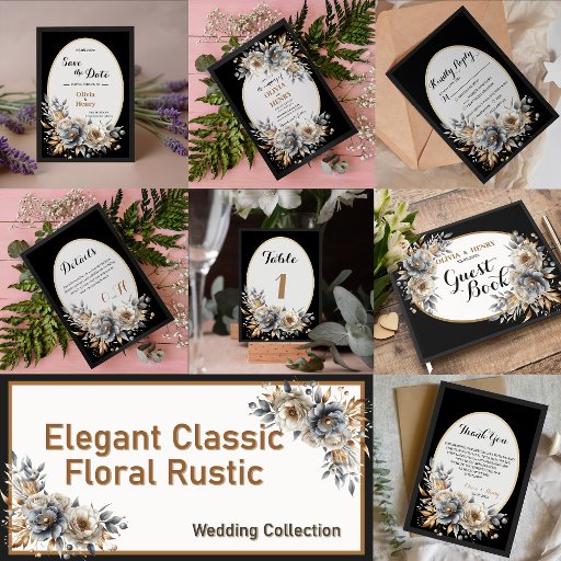 Elegante klassische florale rustikale Hochzeitseinladung 5. Diese elegante Hochzeitseinladung besticht durch ein zeitloses Blumendesign mit weichen Elfenbein-, Gold- und Silbergrau-Tönen. Set vor einem klassischen schwarzen Hintergrund, es umrahmt die Ereignisdetails wunderschön in einer ausgeklügelten Serif- und Script-Schriftart-Kombination. Ideal für eine romantische Gartenhochzeit, vermittelt es Eleganz, Wärme und Feiern mit raffiniertem Charme.