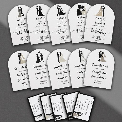 Diese elegante Schwarzweiß-Bogenhochzeit lädt zu einer modernen Hochzeit ein. Das einfache Design zeichnet sich durch eine elegante schwarze Kalligraphie und eine Braut- und Bräutigam-Illustration auf einem sauberen, weißen Hintergrund aus. Die Einladungskarte enthält die Hochzeitsdetails auf der Rückseite, anstatt für eine separate Kapselkarte zu bezahlen.