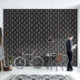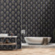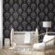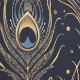 Elegante, dunkelblaue Tapete mit verzierten Deko-inspiriert Illustrationen von goldenen, blauen und grünen Pfauenfedern.