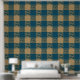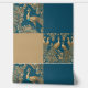 Diese elegante Tapete weist ein Muster großer Quadrate auf, mit detaillierten Pfauendesigns in Blau und Imitat Gold, durchzogen von schlichten blau-goldenen Quadraten. Das Gesamtbild ist kariert, während die aufwändigen Details die Tiefe und das Interesse nah erhöhen.