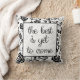 Hier ist ein elegantes, dekoratives Wurfkissen mit einer positiven Botschaft, die mit einem blumengeschmückten Hintergrund und Grafik in extravaganten Buchstaben entworfen wurde, dass das Beste ist noch zu kommen. Auf der einen Seite ist die Dekoration und auf der anderen Seite kann man in kräftigen Farben umgedreht werden.