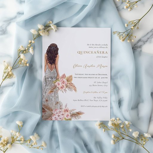 Elegante Rose Pampas Grass Dress Quinceanera Einladung
