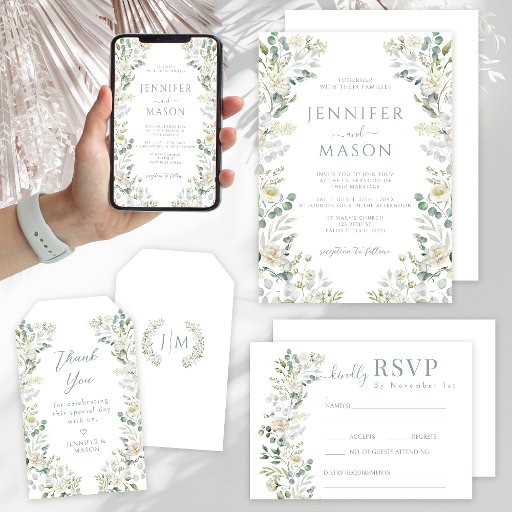 Tauchen Sie ein in raffinierte Eleganz mit unserer eleganten böhmischen, rustikalen Gartenhochzeit in schlauen grünen Farbtönen. Mit einem anmutigen Kranz, der mit weißen Rosen und Eukalyptus-Blätter verwoben ist, ist diese Einladung perfekt für die Feiern mit Grünthemen. Es enthält ein Monogramm und einen QR-Code für Ihre Hochzeitswebsite und fügt eine moderne Touch hinzu.