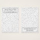 Diese einfache, elegante Karte bietet Vorlagenplatzhalter, mit denen Sie Ihre geschäftlichen Kontaktdaten sowohl vorne als auch hinten hinzufügen können. Ich habe einen hübschen Skript-Schriftart für Ihren Designer oder Geschäftsnamen verwendet, und eine saubere, serifenlose Schrift für alle anderen Details. Der Kartenhintergrund war in einer Grafik dargestellt, die Imitate-metallische Silberkonfetti darstellt. Ein Rechteck mit schwarzer Grenze überlagert diese Grafik und setzt die Textelemente schön ein. Bitte zögern Sie nicht, sich zu melden, wenn Sie Hilfe bei der Anpassung benötigen.