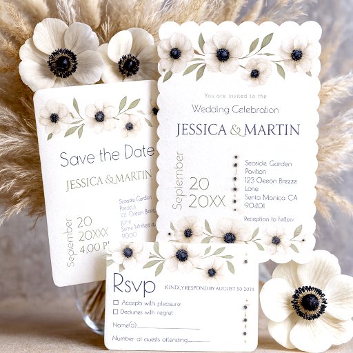 Elegante Watercolor Ivory Navy Blue Anemone Weddin Einladung