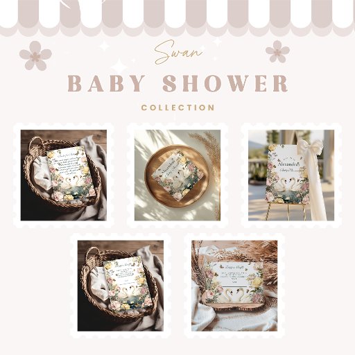 Eine romantische Babydusche mit zwei anmutigen Schwänen auf einem verträumten See, umgeben von sanften Aquarellfarben-Rose, Pfannkuchen und flatternden Schmetterlingen. Ideal, um die Mutter-to-be mit einem zeitlosen und eleganten Thema inspiriert vom Swan Lake zu feiern.