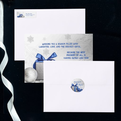 Dieses elegante, moderne und trendige Weihnachtsadressen-Label besticht durch eine Geschenkboxen, die mit einem blauen Band auf einem silbernen Hintergrund geschmückt ist. Das elegante blaue Band, das um die Geschenkboxen geklebt ist, hebt sich wunderbar von der schimmernden silbernen Kulisse ab und verleiht jedem Produkt eine Touch von Luxus und Klasse. Dieses schicke Label zeichnet sich durch ein charmantes, skurriles Design aus, das den Geist von Weihnachten perfekt einfängt. Ideal für diejenigen, die eine raffinierte, minimalistische Ästhetik schätzen, sind diese Designs die perfekte Ergänzung zu Ihren festlichen Festlichkeiten und bieten einen schicken, modernen Flair für Ihre Feriensaison. Das Label ist auch sehr einfach zu personalisieren. Egal ob Sie warme Wünsche oder Feiertagsgruß senden, dieses Label ist sicher, jedem ein Lächeln ins Gesicht zu bringen.