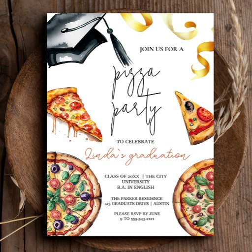 Feiern Sie mit diesem stilvollen Abschluss Pizza Invitation Ihre große Errungenschaft! Mit eleganten Aquarellbildern von Graduierungspapier, Pizza und Pizza verbindet diese Einladung akademischen Erfolg perfekt mit einem lustigen Backyard Cookout Vibe. Die warmen Farbtöne, die künstlerischen Details und die moderne Typografie machen es zu einer exzellenten Wahl für ein unvergessliches Fest. Personalisieren Sie Ihre Daten und machen Sie Ihre Veranstaltung zu einem besonderen Erlebnis!