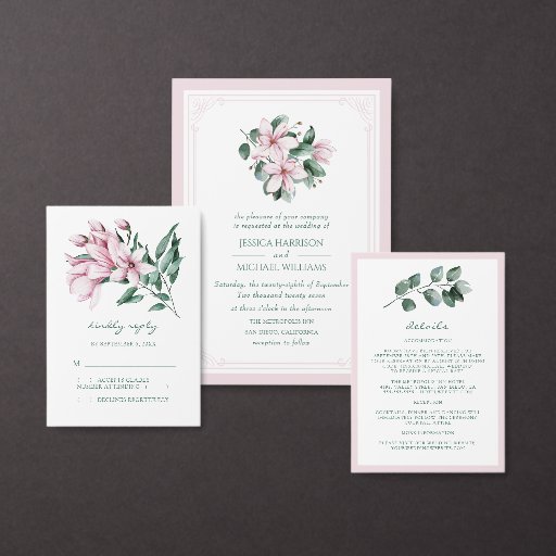 Elegantes und einfaches Hochzeitsdesign. Blume in Aquarellfarben, rosafarbene Farbtöne von hellen bis tieflila, grüne Eukalyptus-Blätter. Die Namen von Braut und Bräutigam in einem reichen Blumenkranz. Elegante Schriftart-Kombination. Dusty rosa (staubige Rose) Grenze. Zeitloses klassisches Farbthema: staubiges Rosa und Grün. Grüne Schrift. Ideal für Frühjahrshochzeit, Blumenhochzeit, moderne, elegante Hochzeit.