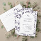 Elegante und schicke lila-weiße Blumen-Gästekarte mit hübschen botanischen Mustern und klassischem Typografie-Design. Laden Sie diese Sammlung für die Koordinierung der Hochzeitseinladungen ein!