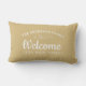Elegantes, schlichtes und stilvolles Lumbalkissen. Dieses Design enthält modernen Skripttext in weißem "Willkommen" auf goldenem Hintergrund, der mit dem Nachnamen Monogramm Ihrer Familie und Ihrer Straßenadresse modifiziert und personalisiert werden kann. Zwei Seiten Design auf der Vorder- und Rückseite inklusive. Dieses goldene Lendenkissen passt perfekt zu Ihrer Wohngestaltung.