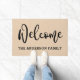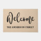 Doormat mit dem Text "welcome" in einem schwarzen, eleganten Skript-Schriftart mit Ihrem Familiennamen unten auf einem hellbraunen Hintergrund. Alle Farben sind mit dem Designwerkzeug anpassbar.