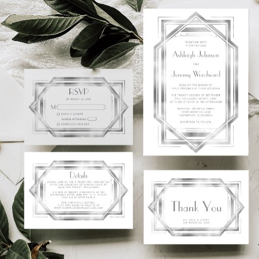 Diese Vintag inspirierte Hochzeitseinladung mit silbergrauem Text auf weißem Hintergrund, gerahmt durch ein silbernes Imitat, das geometrische Deko Vintager Kunst umrahmen. (Die untere, separat verkaufte Kartenschicht ist in der folgenden Kollektion erhältlich.)