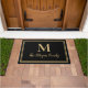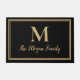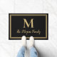 Elegante, moderne, maßgeschneiderte Monogramm-Doormat in klassischen schwarzen und goldenen Doppelbords . Sie können diese einfachen modernen schwarzen und goldenen Doppelgrenzen mit dem Nachnamen Ihrer Familie in Skripten und einer Serifenstil Monogramm Initial personalisieren.