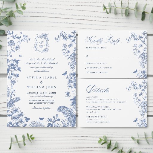Elegantes Blue French Garden Floral Wedding Foto Save The Date