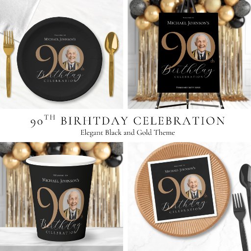 Elegantes Custom Foto Black Gold 90. Geburtstag Foil Einladung. Feiern Sie Ihren Geburtstag mit unserer Einladung zum Black and Gold Simple Elegant, die perfekt dazu geeignet ist, Ihren besonderen Tag mit einer Touch an Eleganz zu bereichern. Dieses individuell gestaltbare Design zeichnet sich durch einen schwarzen Hintergrund mit eleganten goldenen Akzenten aus, der einen zeitlosen und eleganten Look schafft. Personalisieren Sie es weiter mit einem individuellen Foto, um Ihre Einladung wirklich einzigartig und unvergesslich zu machen. Ideal für diejenigen, die eine raffinierte Ästhetik schätzen, diese Einladung Set den Ton für eine Feier, die für die nächsten Jahre geschätzt wird.