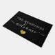 Ein eleganter Familienname Schwarz-weiße Türmatte handgeschriebene Drehbuch Kalligraphie Empfang und Goldenes Herz. Ein eleganter und einladender Eingangsbereich.