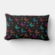 Ein Lumbalkissen, das mit einem eleganten Muster entworfen wurde, mit einer grafischen Abbildung von flatternden Schmetterlingen in vielen hellen Farben, die sehr schön auf dem schwarzen Hintergrund kontrastieren. Whimsikale Blumen, Zierspieße und Blätter verleihen dem Raum einen gewissen Charme.