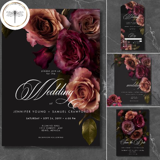 Mit unserer faszinierenden Hochzeitskarte mit drei Dinner-Optionen lassen Sie Ihre gotisch inspirierte Feier zeitlos elegant ausklingen. Ein weicher schwarzer Hintergrund bietet die perfekte Leinwand für einen fesselnden, aber dennoch schlichten Bouquet. Stellen Sie sich ein Eckchen aus gedämpfter Rose vor, in dem sich Rostrot und Bordeaux-Farbtöne mit dunkelgrünem Blattwerk vermischen. Dieses ätherische Design besticht durch seine ruhige Eleganz und eignet sich perfekt für Paare, die eine Touch romantischer Dunkelheit suchen. Ihre Hochzeitsdetails werden in einem modernen Schriftart präsentiert, sodass sie sich wunderbar auszeichnen. Dieses bezaubernde Design schafft eine unvergessliche Einladung für Ihren besonderen Tag und setzt den Ton für ein stimmungsvolles und elegantes Fest der Liebe. Erstellt von der einfachen Farmhouse Press.