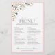 Modernes, elegantes Brautparty-Spiel "What's ion Your Phone" mit Blumenstrauß in sanften Aquarelltönen in Rosa, Pfirsich und Weiß, mit üppig grünen botanischen Blätter in Liebe- und Eukalyptustönen, umgeben von Rosa. Personalisieren Sie Ihre Fragen in weichem Offschwarz, betont durch schöne moderne handgeschriebene Kalligraphie. Teil einer koordinierten Suite. Die vollständige Sammlung finden Sie hier: https://www.zazzle.com/collections/elegant_pink_watercolor_floral_bridal_shower-119520534388034363 Kontakt-Designer für weitere Produkte. Copyright Elegant Invites, alle Rechte vorbehalten.