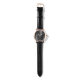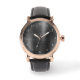 Elegante Armbanduhr aus schwarzem Leder mit goldenen Akzenten in der Rose, gebürstetem Metallstil und weißen Zahlen.