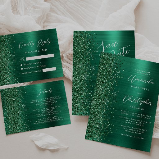 Emerald Green Brushed Metal Glitzer Script Wedding Einladung
