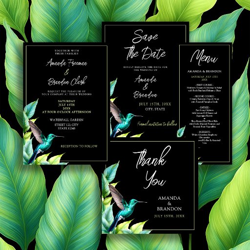 Ein beeindruckendes Hochzeitslayout mit einem lebhaften smaragdgrünen Kolibri inmitten üppiger tropischer Blätter, das Set vor einem dramatischen schwarzen Hintergrund mit elegantem Grün und Weiß. Ideal für exotische Feiern, Ausflüge oder Feierlichkeiten im Freien.