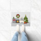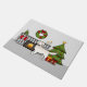 Desteis originelle Cartoon-Illustration einer bezaubernden englischen Creme Farbe Golden Retriever Rasse Hund. Der Hund ist in einem festlichen Wohnzimmer mit Kamin untergebracht. Der Kamin ist eingeschaltet und hat zwei rote Strümpfe an der Seite. Auf dem Kamin befindet sich ein grüner Kranz, der mit einem roten Bogen und gelben Kreisen als Lichter dekoriert ist. Auf dem Mantel stehen drei kleine Dreiecksbäume, die ebenfalls mit gelben Kreisen als Lichter geschmückt sind. Auf dem Mantel befinden sich auch zwei beige Kerzen. Neben dem Kamin befindet sich ein festlich grüner Weihnachtsbaum mit zwei Geschenken. Der Weihnachtsbaum ist mit roten und gelben runden Ornamenten und einer grauen Garage dekoriert. Auf dem Baum ist ein gelber Stern.
